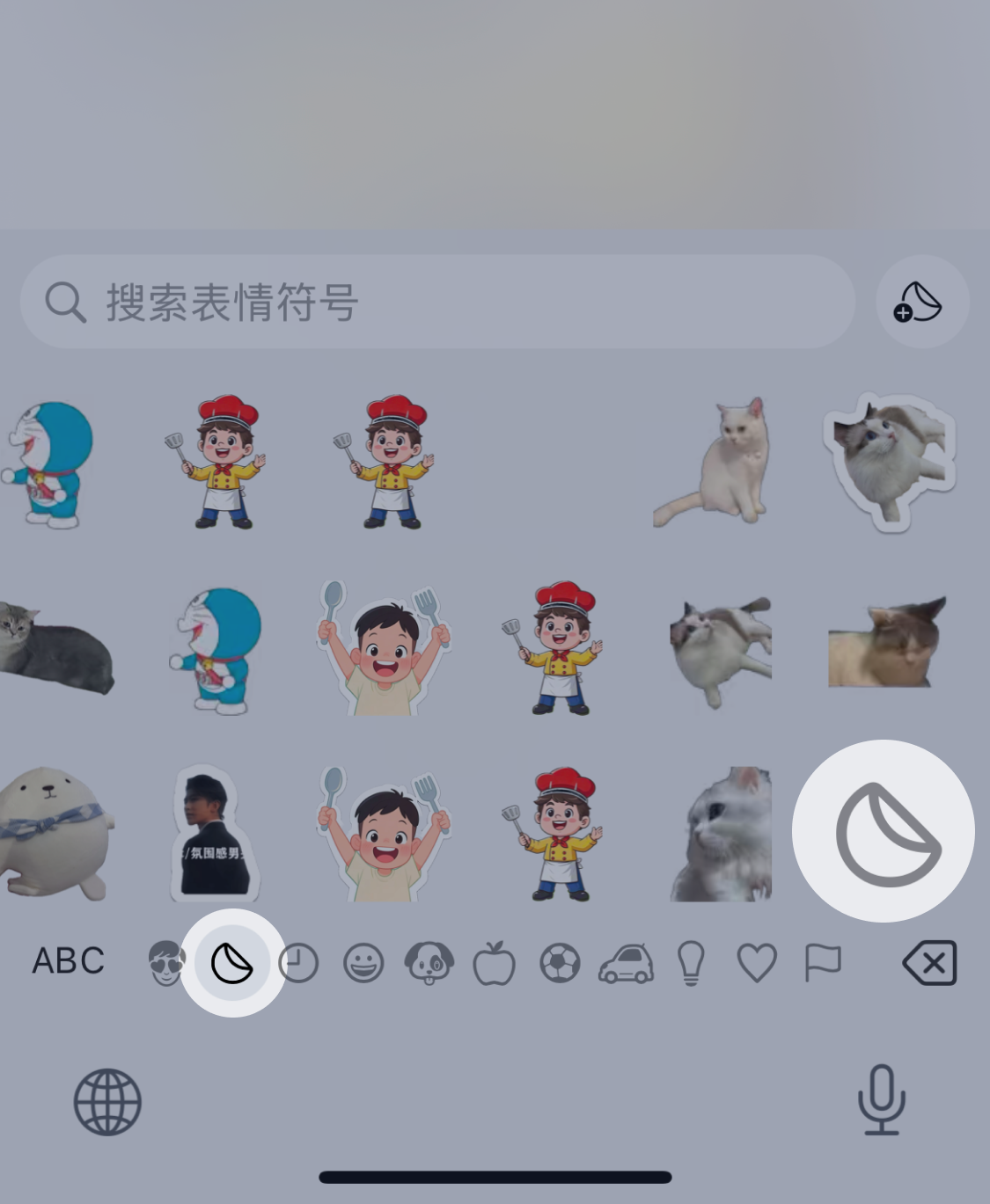 在弹出的键盘底部,切换到贴纸区域,然后点击贴纸按钮来打开贴纸面板。