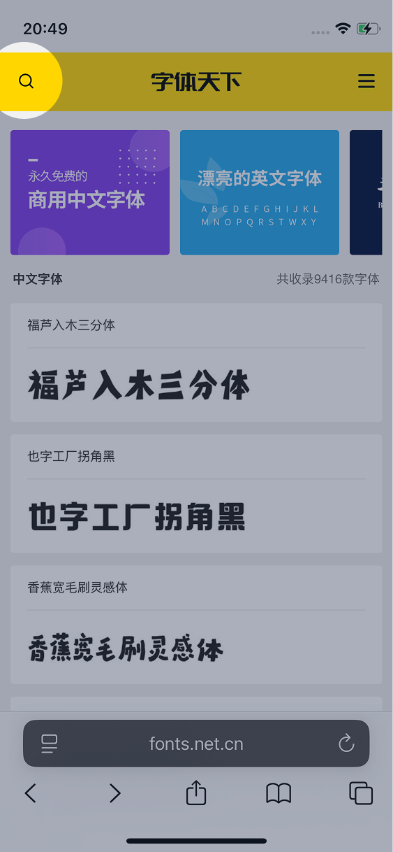 以字体天下为例,进入到网站首页后,点击左上角的搜索图标: