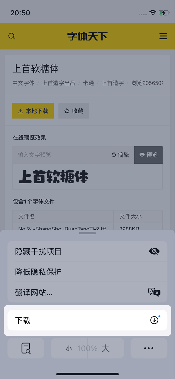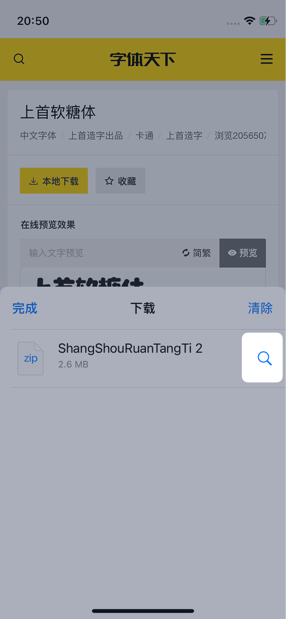 在搜索框中输入想要下载的字体名称,例如「上首软糖体」,然后点击搜索,然后点击搜索结果进入详情页: