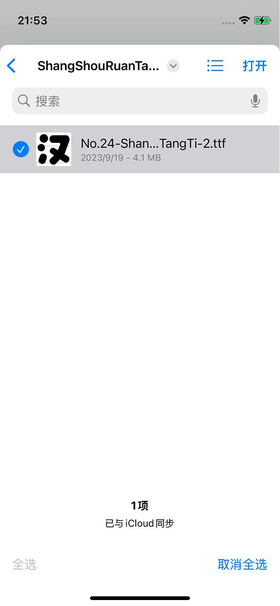 在弹出的页面中选择刚刚下载的字体文件,点击打开即可导入字体文件: