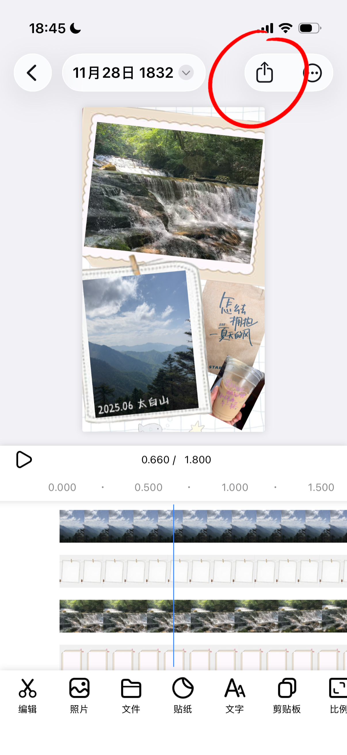 然后点击照片按钮,来添加相框图片,并将其放置到对应实况照片轨道的下层,然后将其调整到合适的位置。